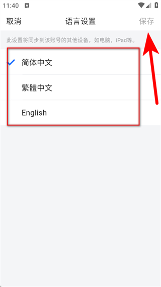 4、在語言設置頁面,選擇需要的語言,點擊保存完成語言設置。