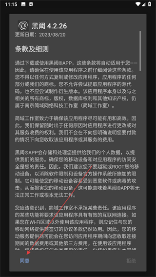 1、打開黑閾應用,點擊條款頁面同意按鈕。
