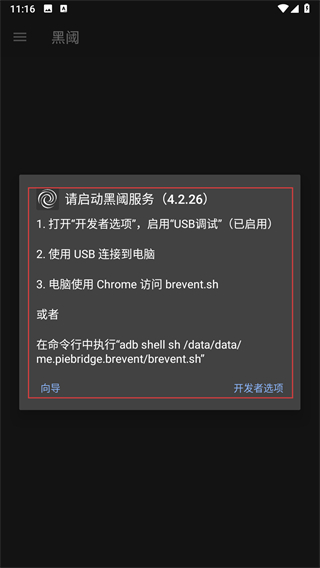 黑閾支持 Android 6.0 到 Android 11,不需要 root,但是依賴“開發(fā)者選項”中的“USB調試”。如果設備支持網絡調試,開啟之后黑閾會自動激活。