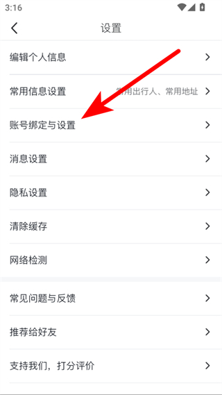 3、在設置界面里,點擊賬號綁定與設置選項,進入賬號綁定與設置頁面。