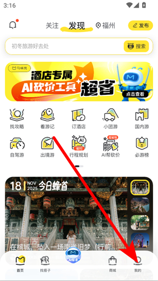 1、打開馬蜂窩APP,點擊底部導航欄的我的選項,進入個人頁面。
