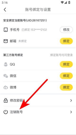 4、在賬號綁定與設置頁面,點擊注銷賬號選項,按提示完成賬號注銷操作。