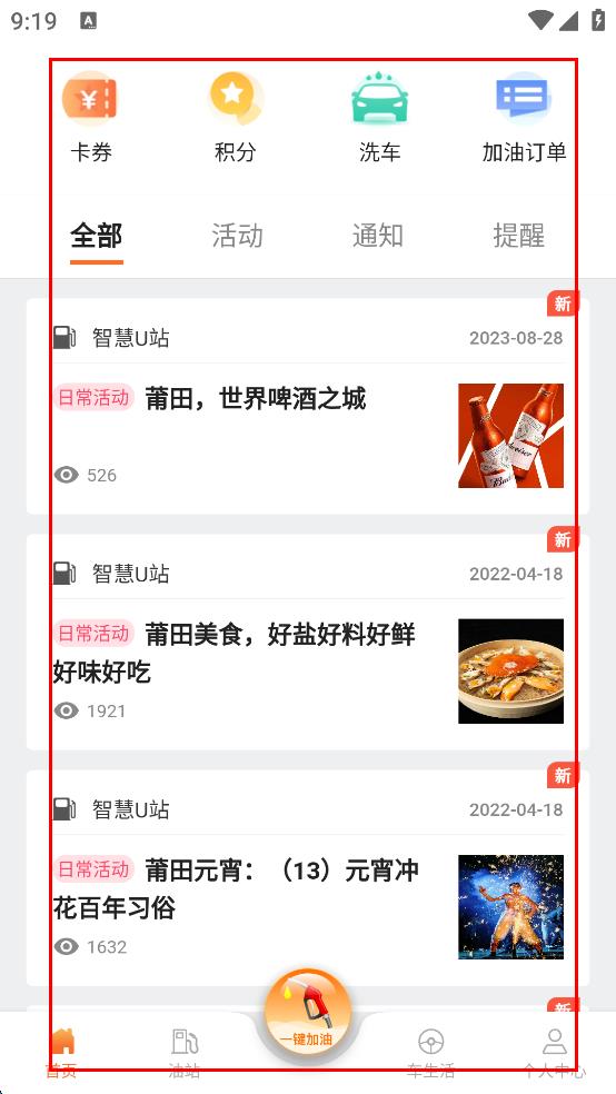 4、在智慧U站主界面,可查看卡券、積分、洗車、加油訂單等功能入口,也能瀏覽首頁展示的各類活動信息。