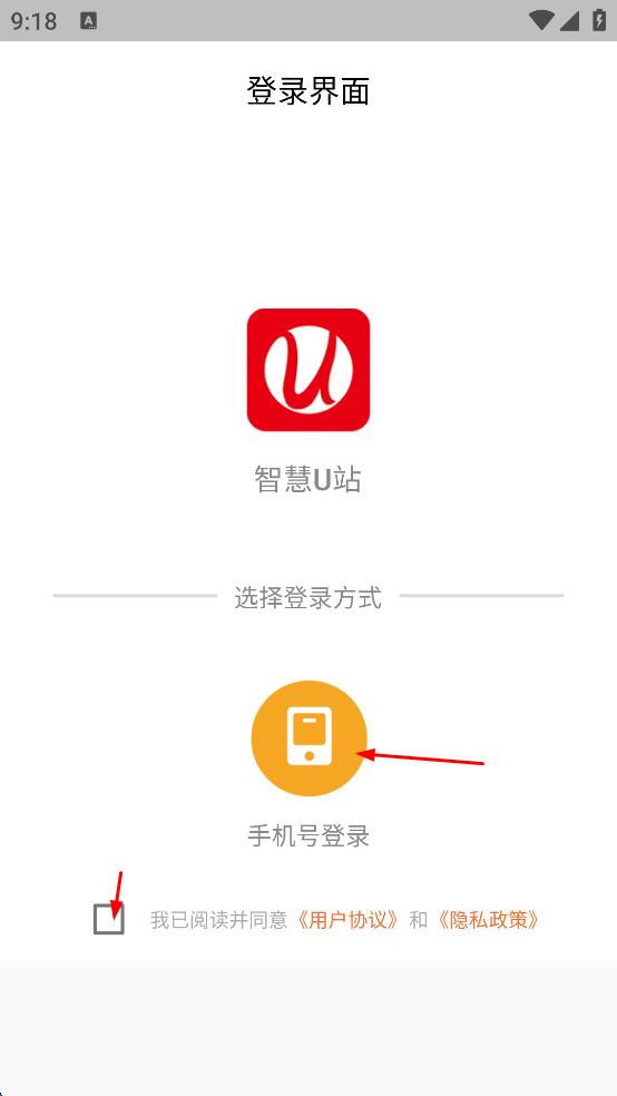 1、打開智慧U站,進(jìn)入登錄界面,勾選“我已閱讀并同意用戶協(xié)議和隱私政策,點(diǎn)擊“手機(jī)號登錄”。