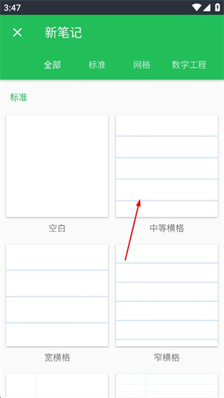3、在模板選擇頁面選擇中等橫格模板,進(jìn)入筆記編輯頁面。
