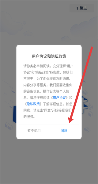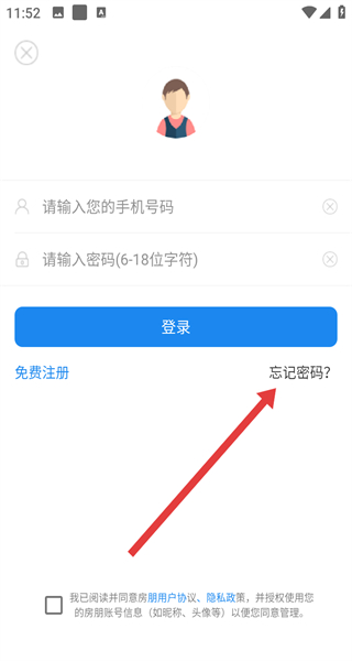 1、點(diǎn)擊同意按鈕,同意房朋的用戶協(xié)議和隱私政策,進(jìn)入登錄界面。