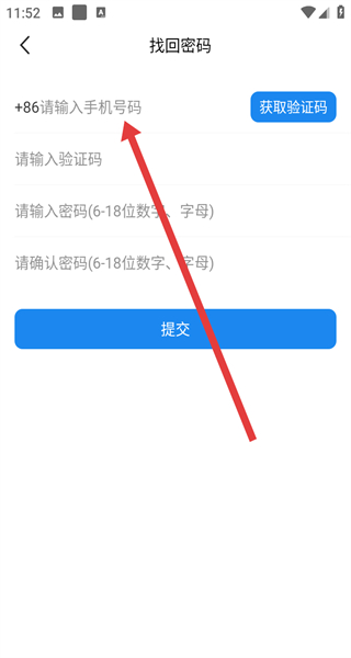 3、在找回密碼界面,輸入手機(jī)號(hào)碼,點(diǎn)擊獲取驗(yàn)證碼。