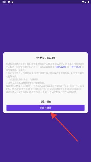 1、打開(kāi)雨燕投屏APP,進(jìn)入時(shí)會(huì)彈出用戶協(xié)議與隱私政策,點(diǎn)擊同意并繼續(xù)即可。