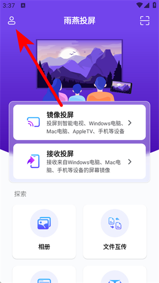 1、打開(kāi)雨燕投屏APP,點(diǎn)擊左上角的個(gè)人圖標(biāo),進(jìn)入我的頁(yè)面。