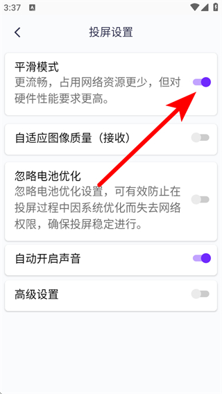 3、在投屏設(shè)置頁(yè)面,找到平滑模式選項(xiàng),點(diǎn)擊按鈕將其關(guān)閉。