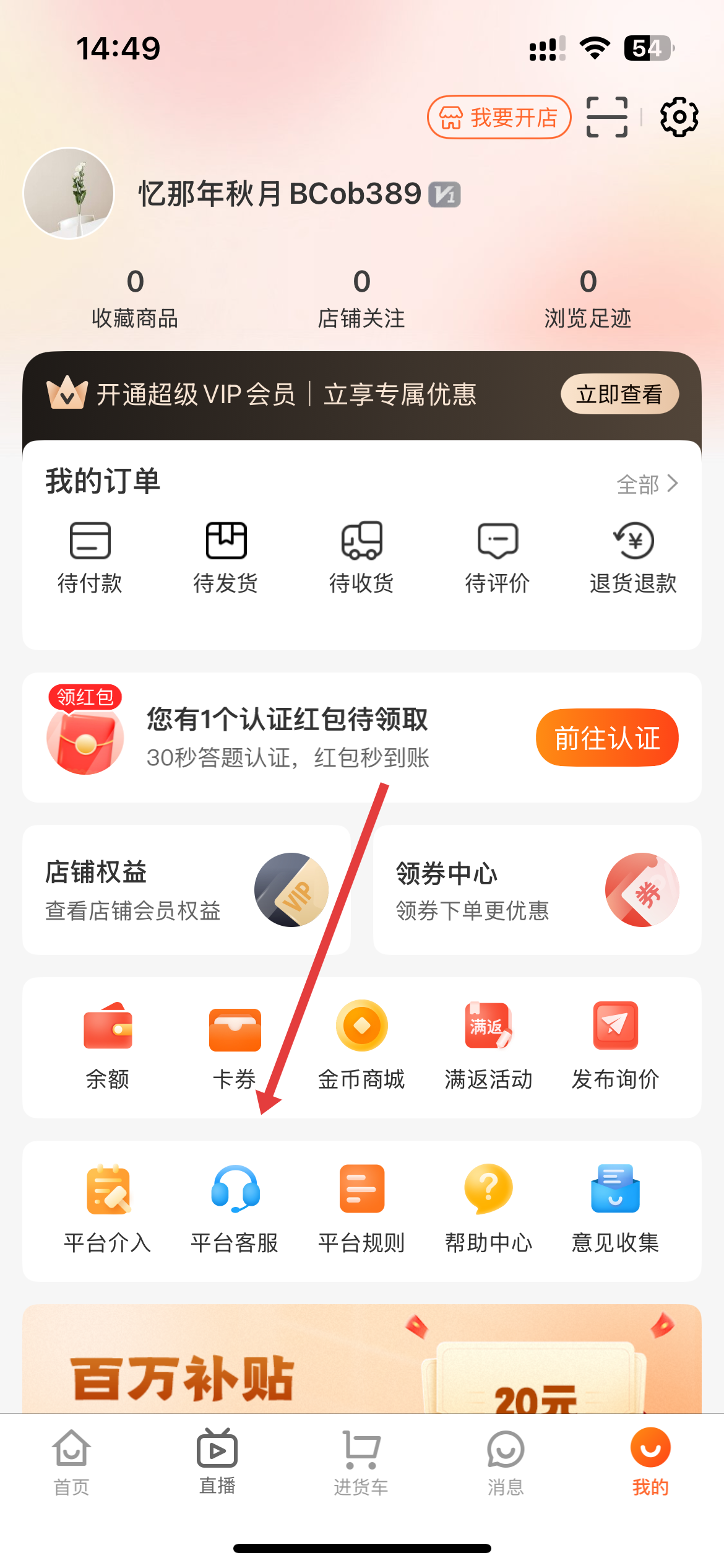 2、在我的頁面中,在下方找到并點擊平臺客服選項,進入客服相關界面。