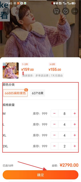 2、在進貨車中選擇衣服的顏色分類、規(guī)格數(shù)量等信息,點擊確定。
