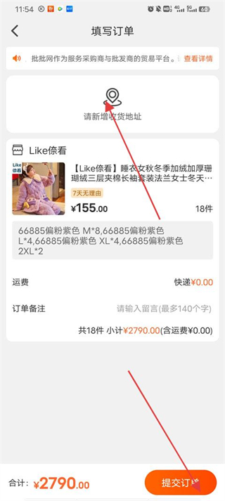 3、進入填寫訂單頁面,新增收貨地址后,點擊提交訂單完成購買。
