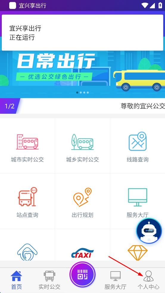 1、打開宜興享出行APP,在首頁點擊右下角“個人中心”選項,進入個人中心頁面。