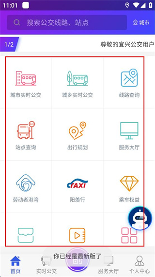 4、登錄成功后,在首頁查看城市實時公交、城鄉(xiāng)實時公交、線路查詢等多項功能。