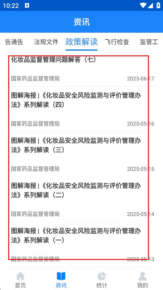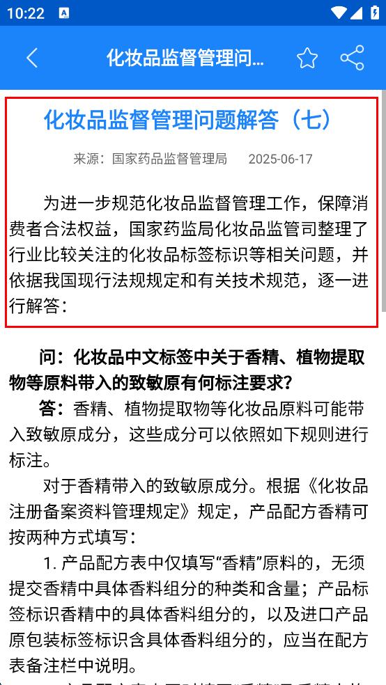 4、在資訊頁(yè)面,選擇“政策解讀”分類(lèi),然后點(diǎn)擊想要查看的資訊文章,如化妝品監(jiān)督管理問(wèn)題解答,進(jìn)入文章詳情頁(yè)查看內(nèi)容。