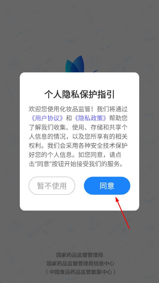 1、打開(kāi)化妝品監(jiān)管軟件,出現(xiàn)個(gè)人隱私保護(hù)指引彈窗,點(diǎn)擊“同意”按鈕,進(jìn)入軟件。