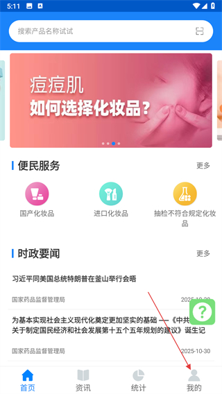 1、打開(kāi)化妝品監(jiān)管app,點(diǎn)擊右下角我的。