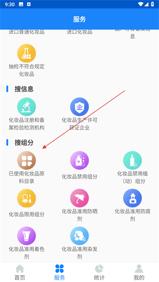 2、找到板塊中的已使用化妝品原料目錄選項(xiàng)并點(diǎn)擊。