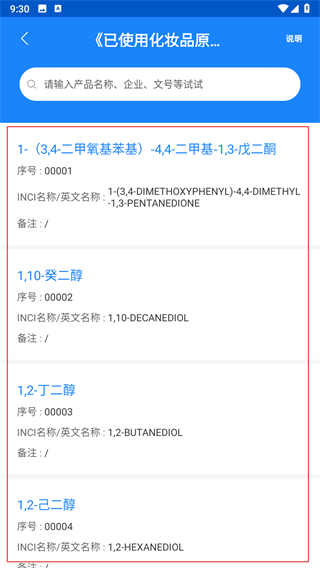 4、進(jìn)入之后,即可查看多種化妝品原料信息等進(jìn)。