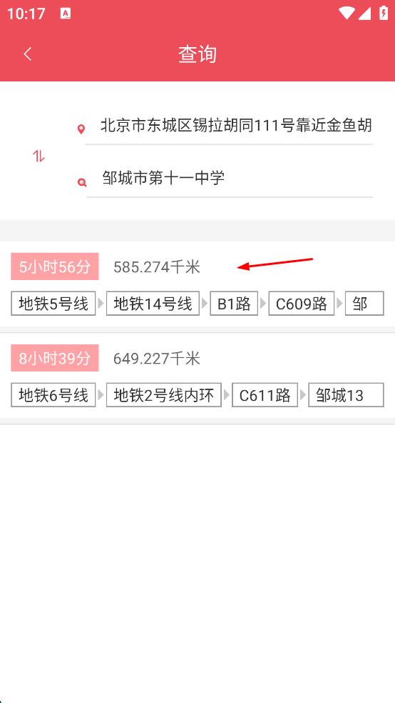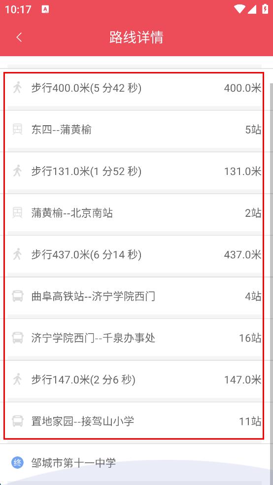 3、在“您的目的地”輸入框中,輸入要前往的目的地,比如鄒城市第十一中學(xué),輸入完成后,等待APP顯示相關(guān)的出行路線選項(xiàng)。