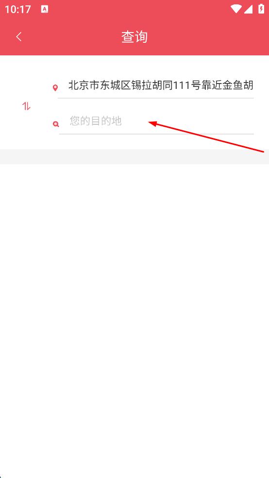 2、在主界面找到查詢相關(guān)功能入口,進(jìn)入查詢頁面,在頁面中找到“您的目的地”輸入框,點(diǎn)擊該輸入框。