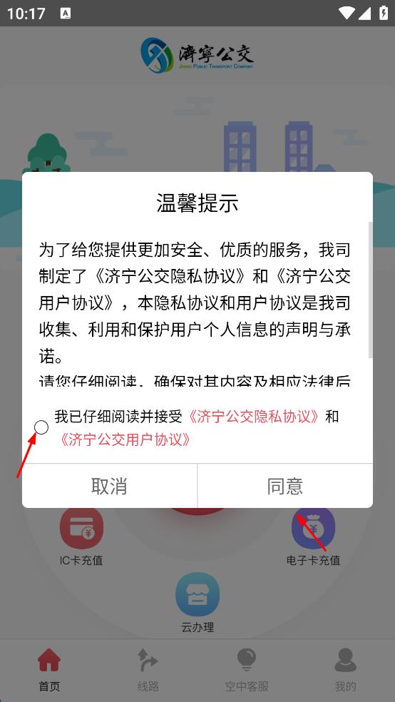 1、打開濟(jì)寧公交APP,看到溫馨提示彈窗,仔細(xì)閱讀內(nèi)容后,勾選“我已仔細(xì)閱讀并接受濟(jì)寧公交隱私協(xié)議和濟(jì)寧公交用戶協(xié)議,點(diǎn)擊同意,進(jìn)入APP主界面。