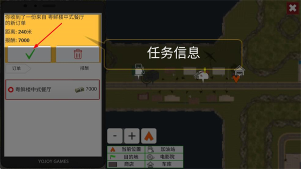 3、確認(rèn)訂單的距離和報酬信息,按照任務(wù)指引駕駛摩托車前往目的地。