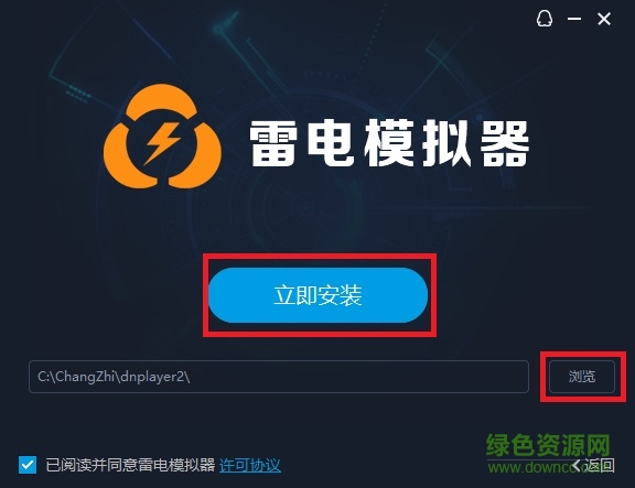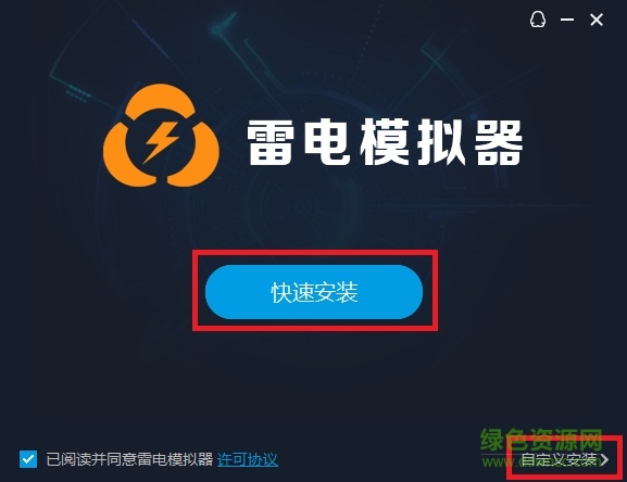 1、在綠色資源網(wǎng)免費(fèi)下載雷電模擬器,雙擊打開下載的.exe文件,進(jìn)入安裝界面,用戶可以選擇快速安裝或者自定義安裝