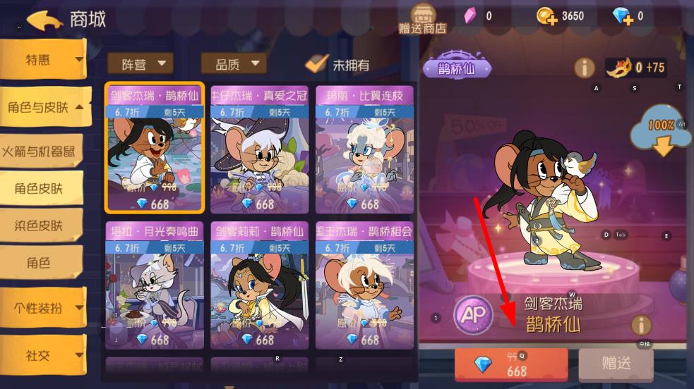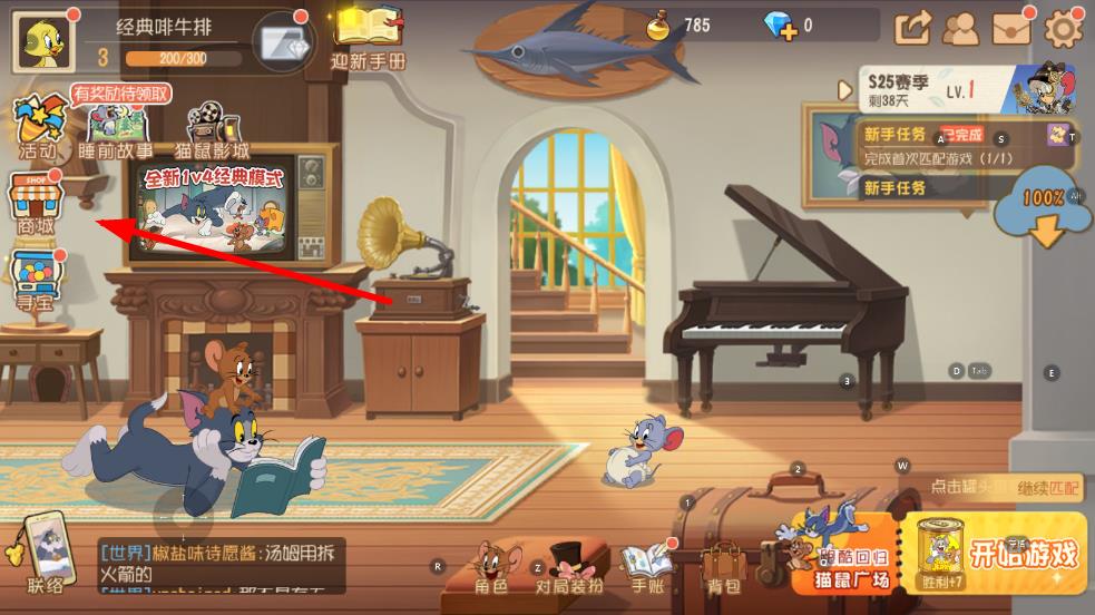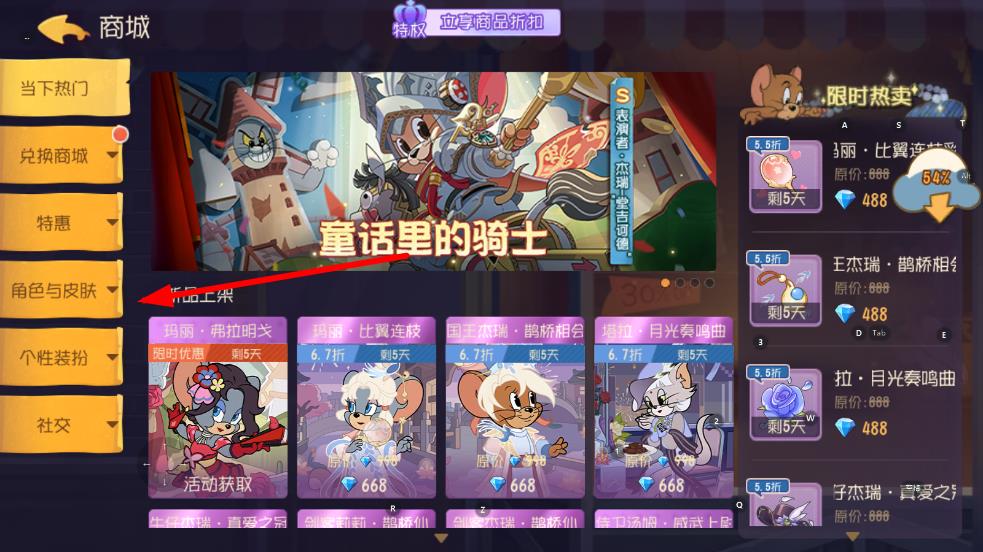 1、打開貓和老鼠游戲進(jìn)入主界面,點(diǎn)擊左側(cè)的商城圖標(biāo),準(zhǔn)備進(jìn)入商城選購皮膚。