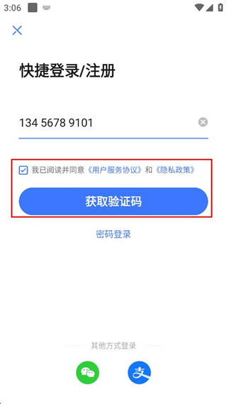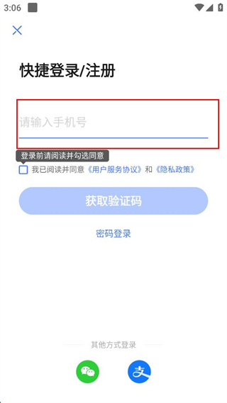 3、在快捷登錄/注冊頁面的輸入框填寫手機號碼,勾選相關(guān)協(xié)議選項。
