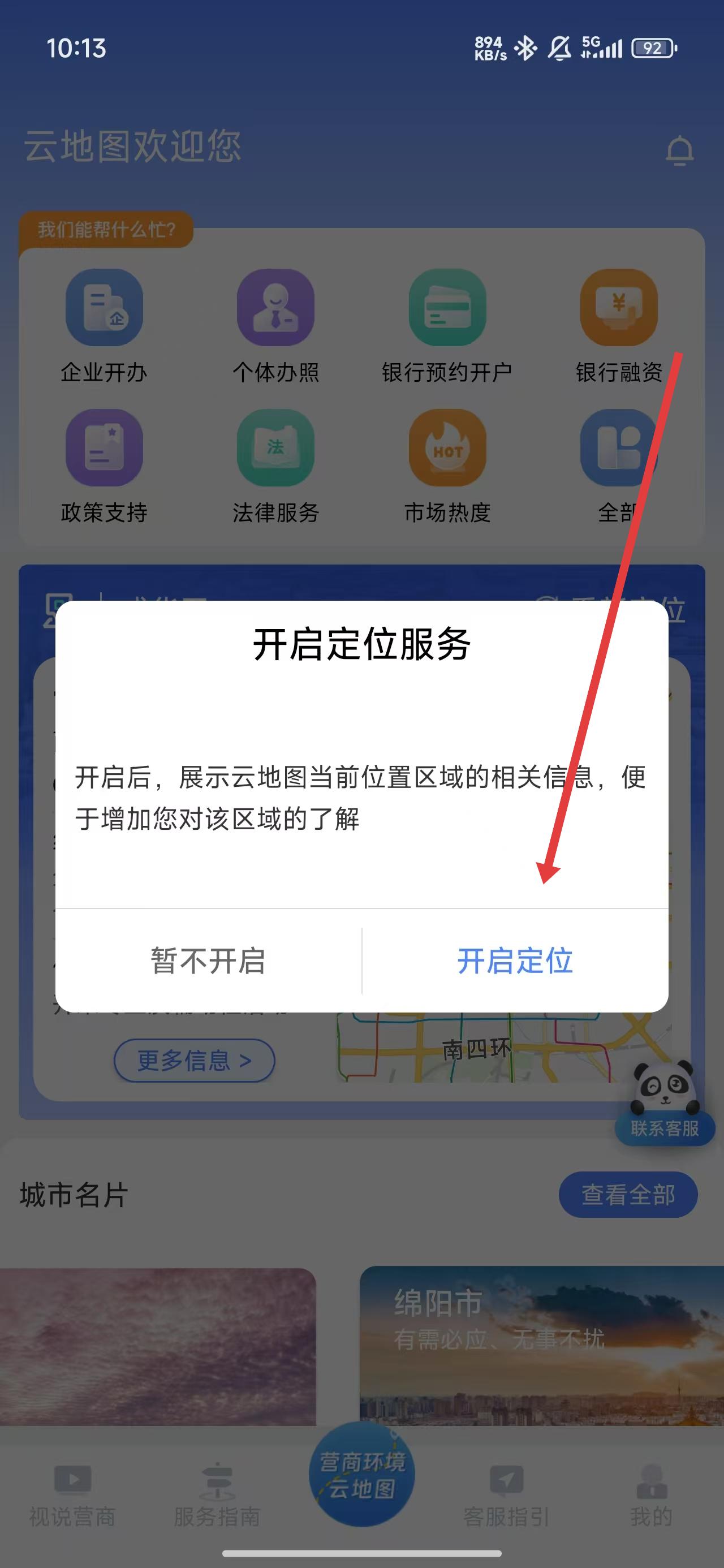 2、在進(jìn)入到app首頁后,點(diǎn)擊彈窗中的開啟定位按鈕,開啟定位服務(wù)。