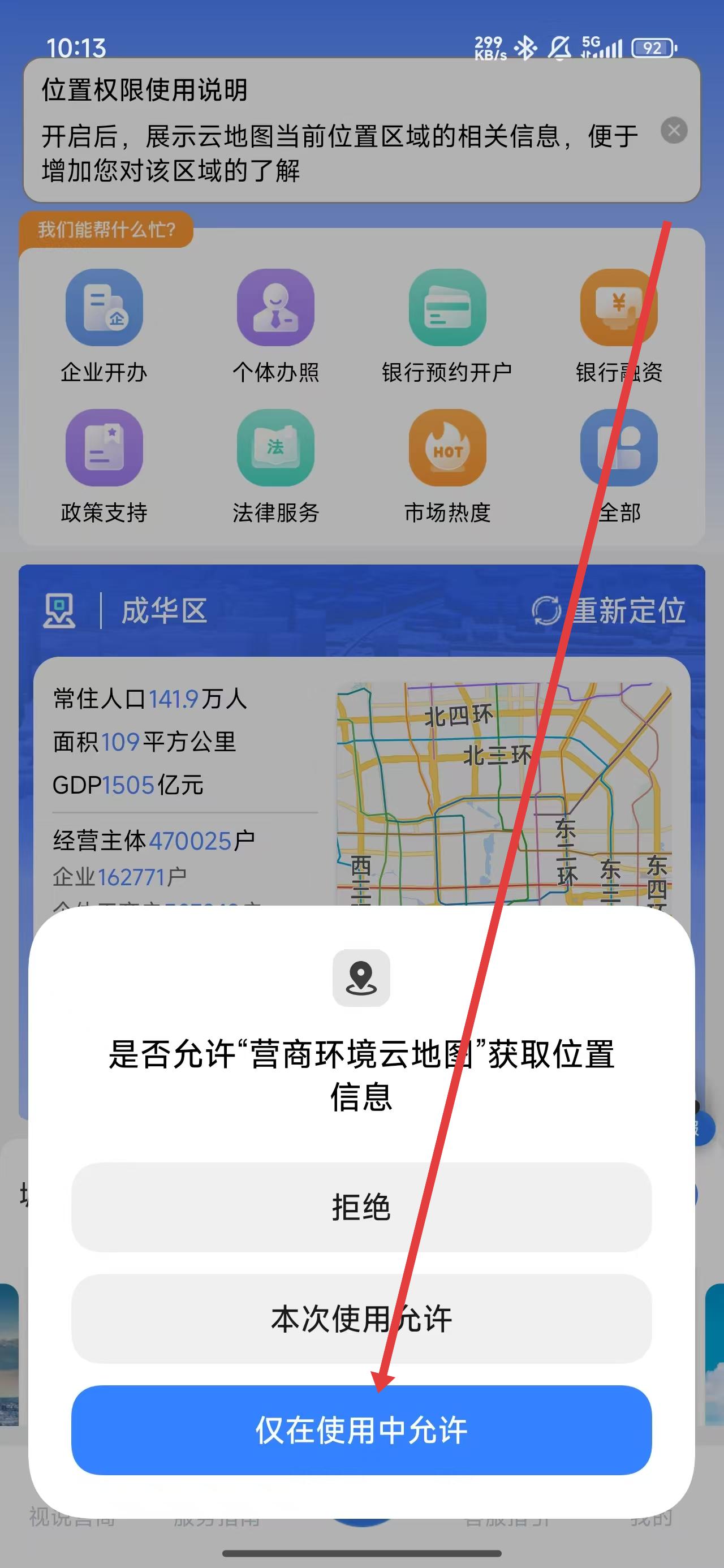 3、可以點(diǎn)擊僅在使用中允許按鈕,使app獲取到位置信息完成開啟定位操作。