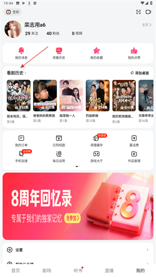 2、進(jìn)入我的界面內(nèi),點(diǎn)擊看劇歷史的按鈕。