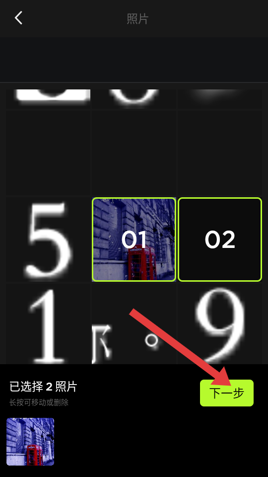 2、在選擇界面選取照片素材,點(diǎn)擊下一步,進(jìn)入拼貼編輯界面。