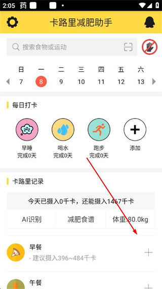 1、在卡路里減肥助手首頁,找到早餐板塊右側(cè)的+,進(jìn)入食物添加頁面。
