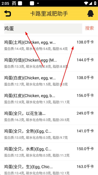 2、在搜索欄輸入食物名稱,選擇對(duì)應(yīng)的食物選項(xiàng)。