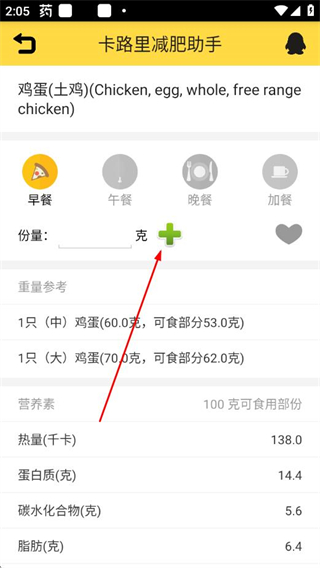 3、在食物詳情頁設(shè)置分量后,點(diǎn)擊+,將該食物添加到早餐記錄中,完成飲食卡路里記錄。