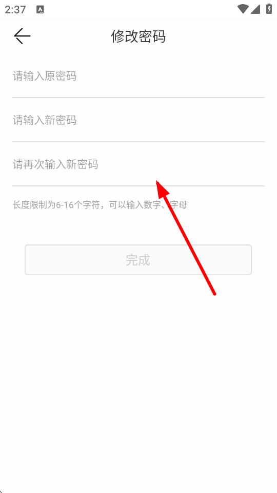 4、在修改密碼頁面,依次輸入原密碼、新密碼、再次輸入新密碼,確認(rèn)無誤后,點(diǎn)擊完成按鈕,即可成功修改密碼。