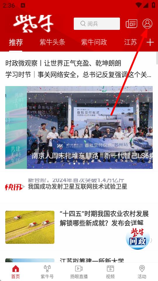 1、打開紫牛新聞App,點(diǎn)擊首頁右上角的頭像圖標(biāo),進(jìn)入個(gè)人頁面。