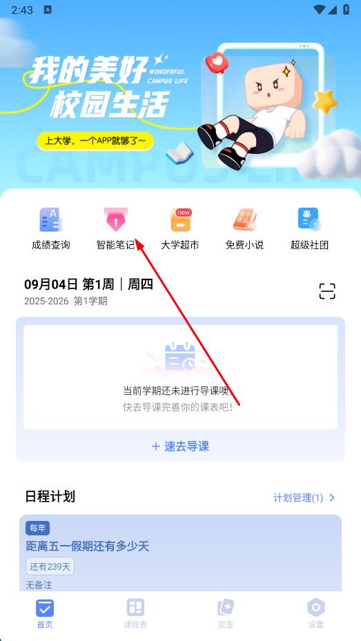 1、打開超級課程表APP,進入首頁,點擊智能筆記選項。