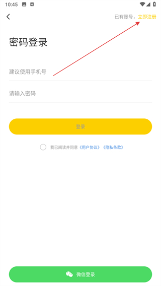 3、點擊右上角立即注冊選項,進(jìn)入注冊頁面。