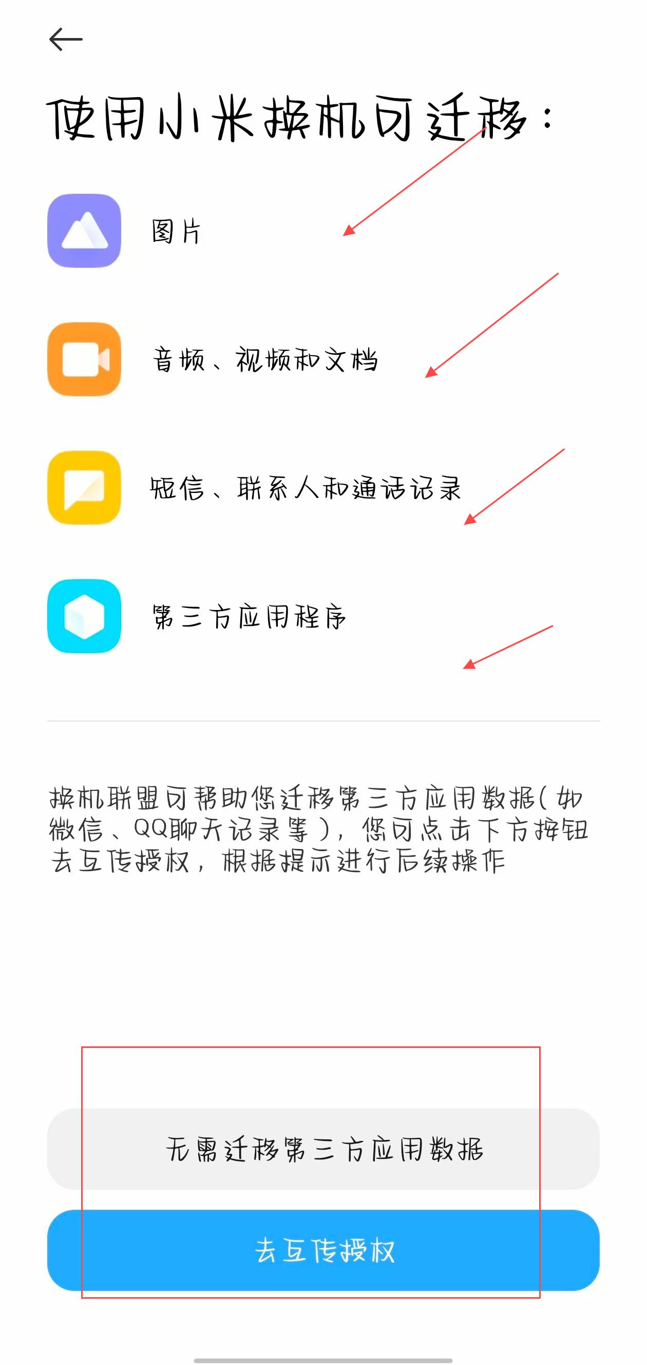 3、若無需遷移第三方應(yīng)用數(shù)據(jù),可直接按提示進(jìn)行后續(xù)操作;若需要遷移第三方應(yīng)用數(shù)據(jù) ,點(diǎn)擊去互傳授權(quán),根據(jù)提示完成授權(quán)等相關(guān)操作,等待數(shù)據(jù)遷移完成即可 。