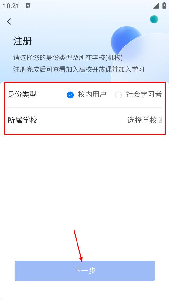 4、在注冊頁面,選擇身份類型,若為校內(nèi)用戶則勾選,然后選擇所屬學(xué)校,完成后點擊“下一步”,按照后續(xù)提示完成注冊流程。