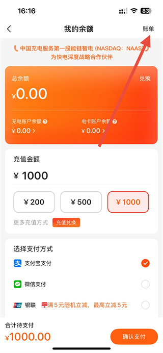 3、在我的余額頁面,右上角找到賬單選項并點擊,進入賬單的查看界面。