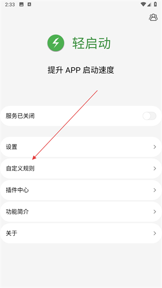 1、打開(kāi)輕啟動(dòng)應(yīng)用,在主界面點(diǎn)擊自定義規(guī)則選項(xiàng),進(jìn)入自定義規(guī)則設(shè)置頁(yè)面。