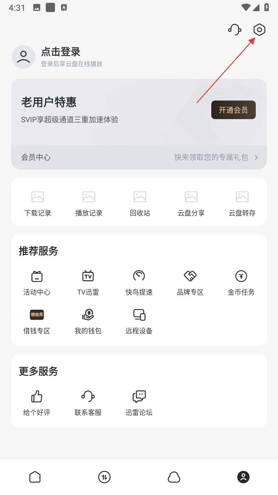 1、打開迅雷APP,點擊界面右上角的六邊形設(shè)置圖標(biāo),進(jìn)入設(shè)置頁面。