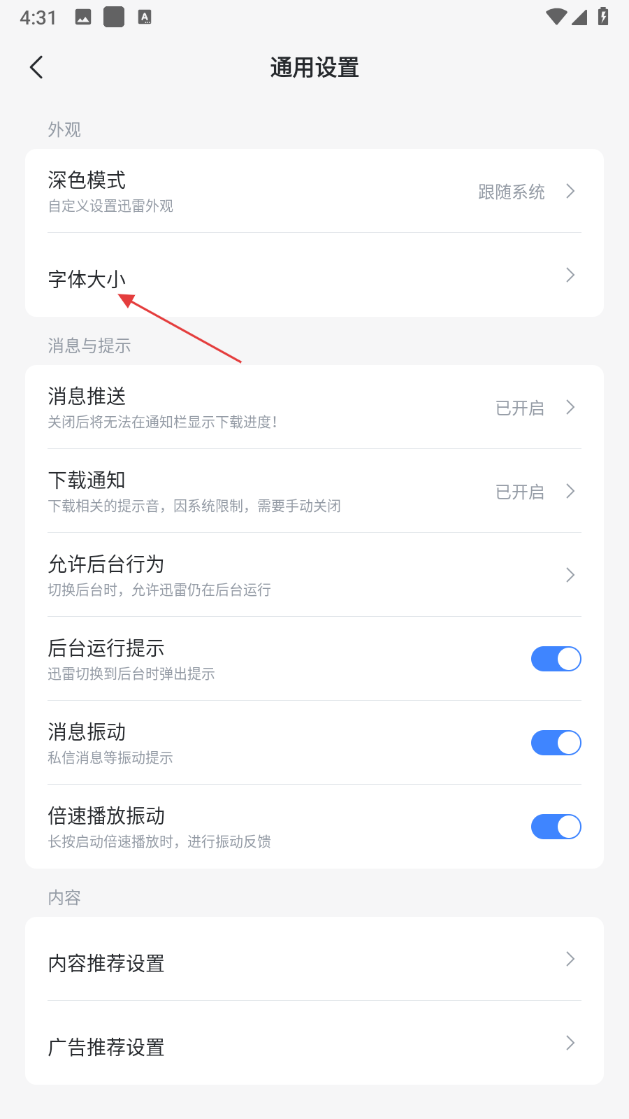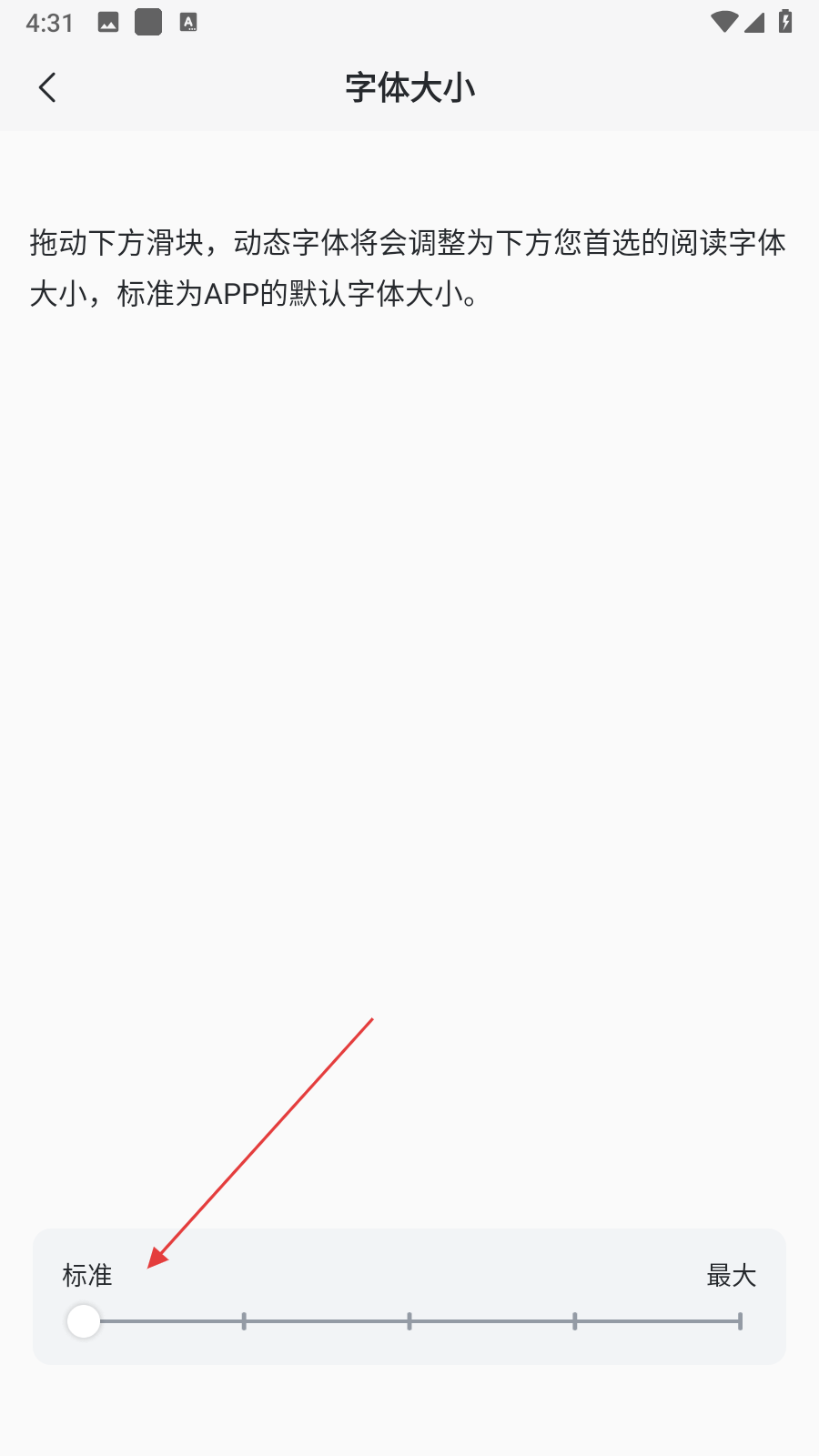 4、在字體大小調(diào)整頁面,拖動底部的滑塊,即可調(diào)整迅雷APP內(nèi)的字體大小。