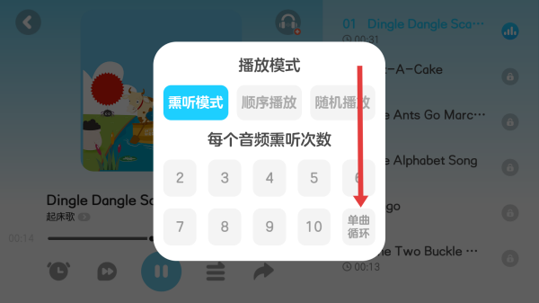 4、可以在播放模式中點(diǎn)擊熏聽模式下的單曲循環(huán)進(jìn)行播放。