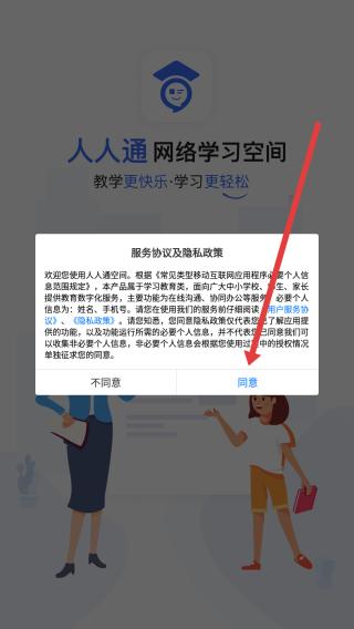 1、進(jìn)入人人通網(wǎng)絡(luò)學(xué)習(xí)空間,彈出服務(wù)協(xié)議及隱私政策彈窗,點(diǎn)擊同意,方可繼續(xù)進(jìn)行登錄、注冊(cè)等后續(xù)操作。
